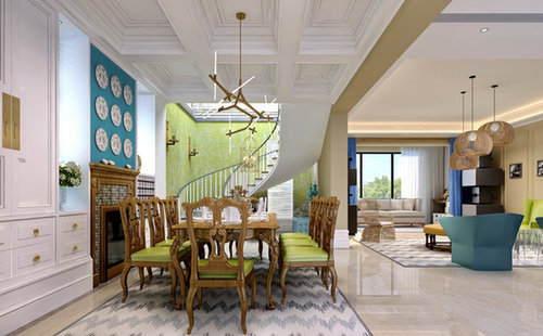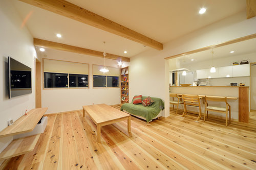 LDKに吹き抜け、化粧梁があります。落ち着いた内装壁、床やカウンター、建具に無垢材を使い、温かい雰囲気に仕上げました。